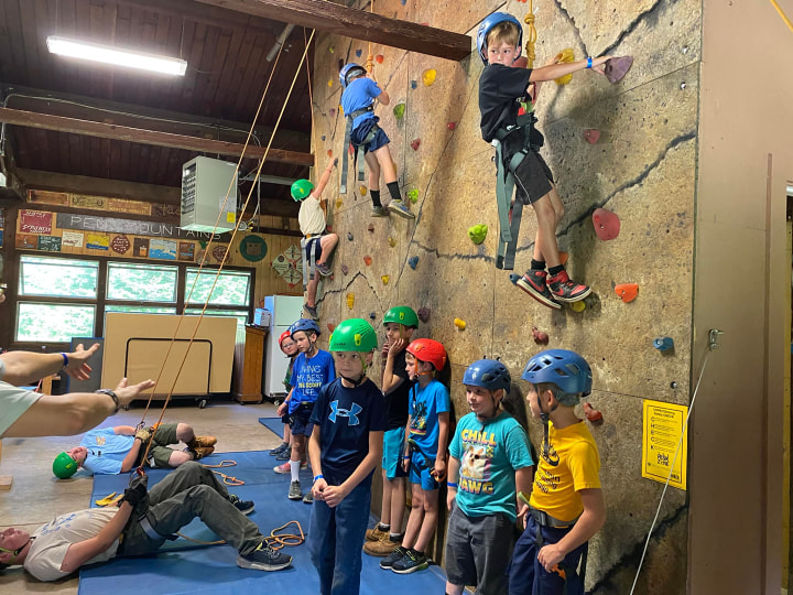 Resident campers will climb on our 16 foot tall climbing wall located inside the Dining Hall. Four climbing lanes of varying difficulties provide plenty of opportunities for the resident campers under the leadership of our certified climbing staff.